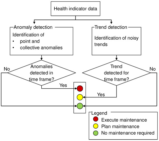 The objective of the presented system is to evaluate whether or . For this, an anomaly detection model and a trend detection model are deployed in parallel. The detection of an anomaly in a defined number of sequential measurements leads to the recommendation of immediate maintenance actions. The detection of trends in the data of a defined number of a sequential measurements leads to the proposal of maintenance actions in the near future. The working principle of the system is summarized in Figure 2. The design of the system addresses different aspects of the industrial robot gear condition monitoring use case. Faults, whose manifestation but not the underlying fault mechanism progress (e.g., tracking of the growth of a crack in a gear tooth) can be tracked with HIs, will cause point or collective anomalies. The AD model will be used for the detection of such faults. Other faults, whose progress can be tracked (e.g., increasing wear), will cause trends in the HI. These trends will be detected by the trend detection model.