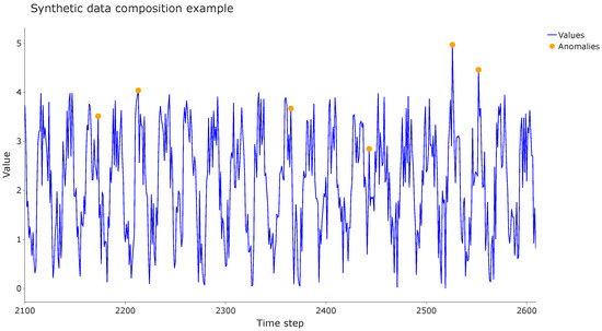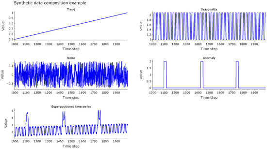 For the model comparison based on synthetic data, a data generator was implemented to create time series as described in Equation (1). Different trend, noise, seasonality and anomaly functions were considered. In detail, linear and quadratic trend functions were implemented. White noise and uniform noise with different variances or ranges were used as noise functions. Sine functions and a hand crafted function as described in Equation (2) were applied for seasonality. Here, t is the current time step, which would relate to the length of one hour of the time series and a is the magnifier factor, which is further described in Table 2. An example of this function is depicted in Figure 4 on the upper right side.