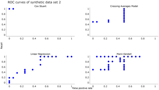 In such a case, a maintenance action should be planned. It can be seen that both models show similar behaviour for the beginning of the data set where they both detect a trend in the data after the initialisation phase of the first 504 measurements. The outlier at measurement 1000 leads to the rejection of the hypothesis that a trend is present for the following measurements in the MK model. It can be assumed that the CS model interprets the outlier correctly so that even for the following measurements a trend is detected. Both models detect the more stationary behaviour of the time series at its end. As the CS model handles the outlier around measurement 1000 better compared to the MK model, it is suggested to use the CS model in CATS. In this experiment, the confidence level parameters from the ROC curve of synthetic data set 2 were chosen for the models that yielded the highest TPR values with the lowest FPR at the same time.