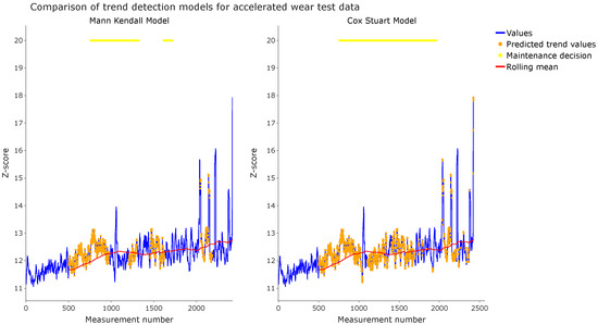 The data from the accelerated wear test was analysed using the two chosen models. The results are depicted in Figure 9. The blue line shows the health indicator values, the dots indicate the models’ decision of whether a trend is present in the time window of the last 504 samples (which equals a time frame of 2.5 months) while the horizontal yellow line shows, when more then 50 percent of the last 504 decisions were positive.