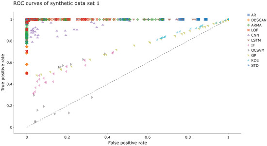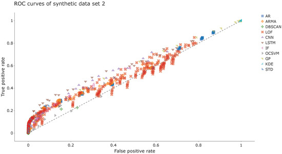 The ROC curves of different models for the synthetic data set 1 are shown in Figure 10. Again, as described in Section 3.1.1 the plot would ideally show dots for the models at the upper left corner. Most of the models show good results except the OCSVM for which parameter combinations exist that yield poor classification performance. This means that all models are capable of identifying anomalies reliably and with a low false alarm rate in the case of high anomaly amplitudes and low noise level. In contrast, the models’ overall performance regarding the synthetic data set 2 is rather poor. Figure 11 summarises the ROC curves for this data set. No perfect classifier was found for all models and the distance of the models’ ROC curves to the upper left corner is large. Here, it can be concluded that the models struggle to detect anomalies at high noise levels and low anomaly amplitudes. This fact will also be discussed in Section 4. The AUC values for all models and both data sets are provided in Table A3. The individual ROC curves of all models for bothd data sets are presented in Figure A1 and Figure A2. The best overall performance show the LSTM, STD and LOF models based on their average AUC values. Hence, it was decided to use the LSTM, STD and the LOF model on the accelerated wear test data.