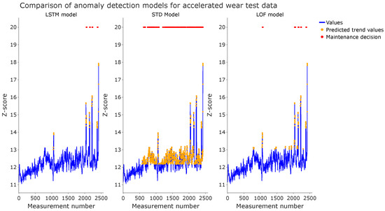 The results of applying the LSTM, STD and LOF models to the data from the accelerated wear test 1 are depicted in Figure 12. For this, all models were trained based on the first 500 measurements with model parameters of the ROC curves that yielded the best compromise between high TPR and low FPR values. It can be seen that all models correctly identify the anomalies at the end of the time series. The LOF model detects the outlier around measurement 1000 as an anomaly. Given a maintenance action decision criterion of 10 detected anomalies in the last 24 measurements, maintenance actions would have been triggered at the end of the data set for all models and a false alarm would have been triggered around measurement 1000 for the LOF model and for many more time ranges for the STD model. The AD models’ behaviour on the second data set are summarized in a similar manner in Figure 13. In this scenario, the models were trained using the first 200 measurements with the same model parameters. It can be seen that the LSTM model and the STD model detect more anomalies than the LOF model along the time series. The apparent anomaly at the end of the time series is detected by all models.The LSTM triggers two false alarms around measurement 300. The STD model triggers many false alarms. Summarising, the STD shows more false alarms compared to other models. The LOF and LSTM model detect only the apparent anomalies with a low false alarm rate. Hence, it is suggested that either the LOF model or LSTM model is used in CATS as the AD model.