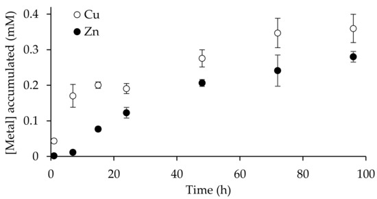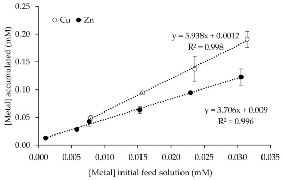 For both Zn and Cu, the effect of the initial metal concentration (in the range 0.001–0.03 mM for Zn and 0.008–0.03 mM for Cu) on their accumulation in the receiving phase was studied. The results are presented in Figure 4, where it can be seen that the relationship between the metal accumulated in the receiving phase and the metal initially present in the feed phase follows a linear trend, with the accumulation of Cu being higher than Zn, under the same conditions.