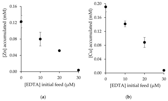 Effect of EDTA on metal accumulation. Feed phase: 100 mL of 0.03 mM of Zn (a) or Cu (b) in 0.01 M KNO3, pH 6.0 and EDTA: 0 to 30 µM; PIM: M2; receiving phase: 5 mL 0.01 M HNO3 (n = 3).