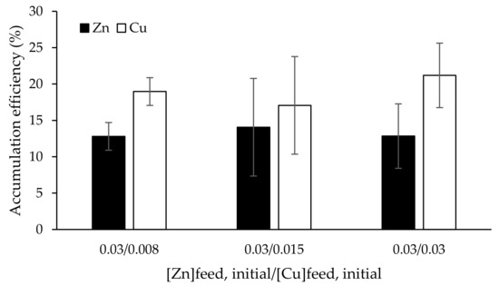 For Zn/Cu competitive studies, the accumulation efficiency was calculated by means of Equation (1)