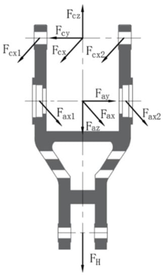 As shown in Figure 3, Fcx, Fcy, and Fcz are the forces exerted by the upper and lower rocker arms at the connection holes; Fcx1 and Fcx2 represent the force component distributed by Fcx to the two connecting holes.