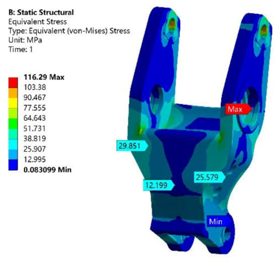 The analysis shows that before optimization, the maximum equivalent stress of the lower rocker arm is 116.29 MPa, and the maximum stress occurs at the transition between the front casting of the lower rocker arm and the web plate; the maximum displacement is 1.082 mm, which occurs at the pull ring at the tail of the lower rocker arm. The material of the lower rocker arm is ZG270-500 and the safety factor is 1.4, so the allowable stress of the lower rocker arm is 192.8 MPa. The maximum deformation is approximately 0.045% of the total height of the rocker arm and the allowable strain of the material of the lower rocker arm is 0.27%. The maximum stress and maximum deformation of the lower rocker arm are less than the allowable value, so the structure of the lower rocker arm is reliable. At the same time, the arm body of the lower rocker arm undergoes a small stress; the maximum stress is no more than 30 MPa, as shown in Figure 5. Therefore, the size parameters of the internal cavity structure of the arm body are selected as the object of the lower arm’s lightweight design.