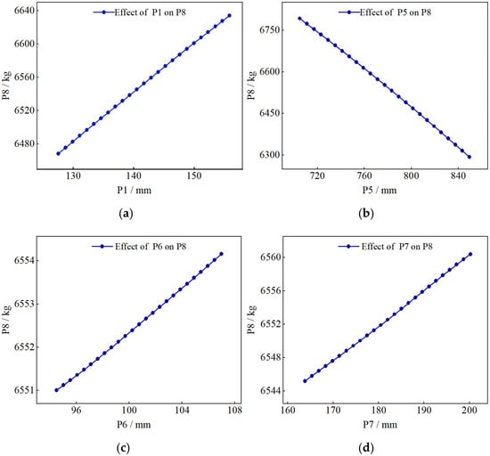 Relationship between the mass of the lower rocker arm and the four input variables: (a) relationship curve between P8 and P1; (b) relationship curve between P8 and P5; (c) relationship curve between P8 and P6; (d) relationship curve between P8 and P7.