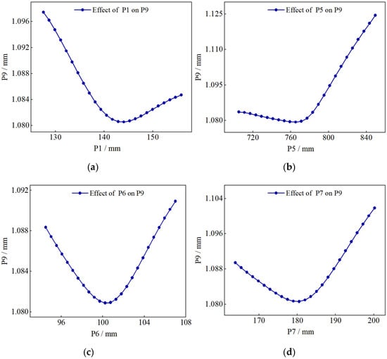 Relationship between the maximum displacement of the lower rocker arm and four input variables: (a) relationship curve between P9 and P1; (b) relationship curve between P9 and P5; (c) relationship curve between P9 and P6; (d) relationship curve between P9 and P7.