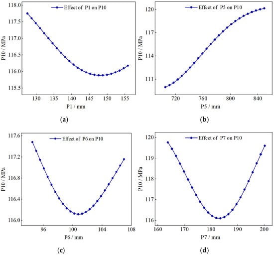 Relationship between the maximum equivalent stress of the lower rocker arm and the four input variables: (a) relationship curve between P10 and P1; (b) relationship curve between P10 and P5; (c) relationship curve between P10 and P6; (d) relationship curve between P10 and P7.