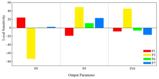 Sensitivity of the input variables to the mass (P8), maximum displacement (P9), and maximum equivalent stress (P10) of the lower arm.