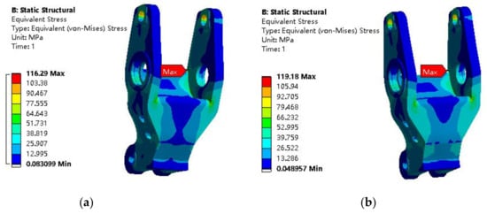 Figure 12 shows the equivalent stress distributions of the lower rocker arm before and after optimization. It can be seen from the diagram that the position of maximum equivalent stress did not change before and after optimization, which occurred at the transition between the front end of the lower rocker arm casting and the web welding. The maximum equivalent stress of the lower rocker arm was 116.29 MPa before optimization, and the maximum equivalent stress after optimization was 119.18 MPa. It was observed that the maximum equivalent stress value increased slightly, but both of them were lower than the allowable stress value of the material (198.2 MPa); its strength meets the design requirements.