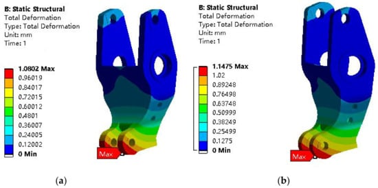 Figure 13 depicts the displacement distribution before and after the lower rocker arm optimization, respectively. As demonstrated in Figure 13a,b, the maximum displacement in both occurs at the pull ring, which is at the tail of the lower rocker arm, and the optimized displacement value increases. The optimized displacement value increased to 1.147 mm, which is less than the set allowable displacement of 1.5 mm. It can therefore be concluded that its deformation meets the design requirements.