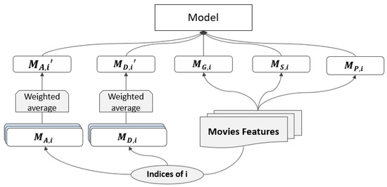 Drafted-Input, which refers to the preferences of actors, directors, and users, must change over time. Therefore, Drafted-Inputs except for , , and were included in the learning target together with the model parameters during training. As shown in Figure 1, and were features combined into one dimension by weighting all actors/directors included in the target movie. Therefore, when updating, all and included in the target movie were updated using the gradient of and as it was.