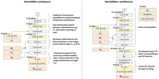 MovieDIRec (left) and MovieDIRec+ (right) model architecture. Yellow boxes mean FC layers, and red boxes mean Drafted-Input.