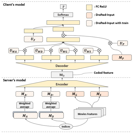 In this paper, we propose a movie recommendation system that focuses on the latter, improving accuracy, and also providing an appropriate configuration to apply it in a practical client–server environment. The reason why the scope is limited to movies is that the proposed method has the characteristic of operating only in one domain, and the data are relatively open compared to multiple domains. In this paper, movie data of IMDB and rating data of MovieLens-20m were used [13]. We propose two types of DNN-based models that learn through the user’s implicit feedback and provide personalized recommendations; the first is a model that is as rough as possible so that it is easy to understand and modify concepts and can be applied in a centralized environment. Second, the Auto-Encoder concept is applied to the first model in consideration of the practical environment so that the server and the client divide and share the operation. It is a model that reduces the traffic for inference as much as possible.