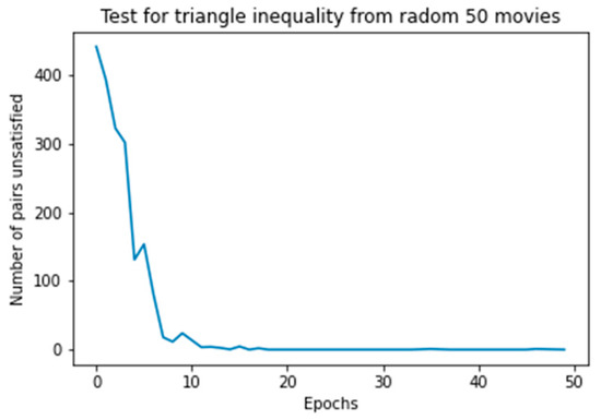 However, according to [22,23,24], the matrix factorization method did not satisfy the triangle inequality caused by the dot product. Since a matrix composed of t-SVD was included among the components, it was necessary to check that the similarity check between the transformed vectors was valid. There was one interesting point here. Figure 4 is a graph that visualizes cases in which the triangle inequality was checked and unsatisfied for all pairs by sampling each epoch for 50 random as the experimental results. As shown in the graph, it was seen that the feature was updated in a direction that satisfied the triangle inequality by a nonlinear transformation. This was a more meaningful result as a test using a model with fixed t-SVD features, except for input training.