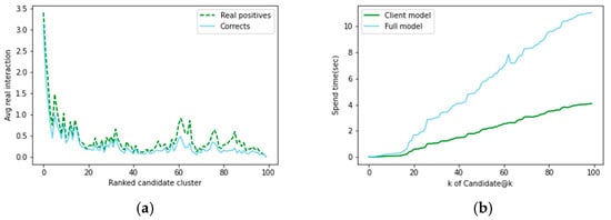 Analyzing the table, the candidate process and split model approach were very efficient methods in terms of load sharing. By limiting the candidate group to 10, the number of inference objects was reduced by 10 times, but the inference speed was increased by more than 20 times compared to the comparative model. This was not due to the reduced number of inference objects, but was judged to be a load due to the huge input data handling that occurred during the entire reasoning. Figure 5b is a graph measuring the consumed time for inference by increasing the k of Candidate@k from 1 to 100 using it as a related visualization graph. As a result, the second column of Table 4 took longer than the 2.9961 s, which was the time taken for the client model that did not use the candidate. This was a phenomenon caused by the operation of indexing the movies in each cluster together with the load caused by the huge input data handling of the total inference.
