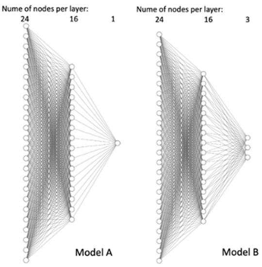As part of our analysis, we examined various fully connected MLP models and hyperparameters and found that the two MLP models, illustrated in Figure 1, possessed the highest prediction accuracy for the examined dataset. Each model is a fully connected network which consists of three layers (beside the input layer): (1) the first layer has 24 neurons, each connected to the input features described in Table 1, (2) the second layer has 16 neurons, and (3) an output layer. The output layer in the first model (MLP model A) has a single neuron which provides a binary prediction (low or high) for a COVID-19 patient’s level of disease severity. For the second mode (MLP model B), the output layer has three neurons that predict severity in three levels (low, medium, or high). Each neuron in our MLP models uses the sigmoid activation function.
