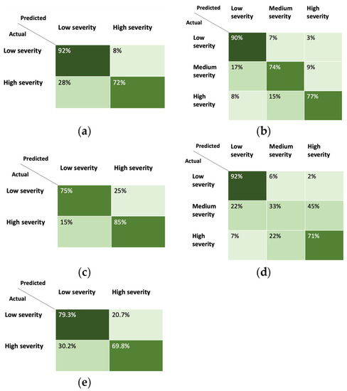 Figure 2a,b illustrate the prediction accuracy for each of the MLP models through the training process. In the validation phase, the overall prediction accuracy was measured using the validation dataset. MLP model A achieved 80% accuracy, while MLP model B achieved approximately 78% accuracy. Figure 3a,b depict the confusion matrixes of the two MLP models. It can be observed that MLP model A achieved 92% and 72% prediction accuracies for patients diagnosed with COVID-19 with a low and a high level of severity, respectively. Model B achieved a prediction accuracy of 90%, 74%, and 77% for patients diagnosed with COVID-19 with a low, medium, and high level of severity, respectively.