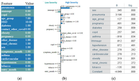 Example of a patient diagnosed with COVID-19: (a) patient’s medical history, (b) explanation of the prediction, and (c) binary regression variables in equation.