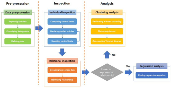 The overall workflow was categorized into three steps: preprocessing, inspection, and analysis (Figure 1). All steps were performed in Python 3.6 software (Python Software Foundation, Wilmington, NC, USA) using the scikit-learn library [30]. The sensor data were processed to be suitable for individual and relational inspection. The relational inspection consisted of clustering and regression analysis.
