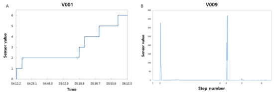 The individual inspection was performed for the stabilization of each sensor. We could clearly discern the process ready to be initiated when all sensors were in control normally. The software we developed in this study could inspect each sensor’s status through the SPC method. The V001 sensor was a timer representing the step change, showing that the process consisted of six steps (Figure 3A). V009 is exemplified for the peak sensor group, indicating the peak of which appeared twice: steps 2 and 4 (Figure 3B). Such an output was repetitive during the whole process. We separately extracted the peak at each step and applied the SPC method to each preprocessed data (Figure 2B). The fraction of the outlier over the dataset was 33.3% in both steps, respectively, during 25 processes. It might be in a stabilization where the sensor output could be fluctuated. When there was none of the data beyond UCL and LCL, we could proclaim the stable state. This SPC method made the process wait for the sensor output to become stable against time. As the sensor output becomes stable against time, the process gets the full-fledged initiation. Additionally, it helped to reduce the delay time of a wafer. Too long wafer delay time might damage the wafer due to the high temperature or dense chemical gas concentration [33]. This could become a trigger of some faults generated in the afterward manufacturing process. During the process, we assumed that the effect of time on the sensor output could be negligible as compared to the effect of the other property changes. At the end of every process, the initialization step (remarked as step 0) followed to become stable again.