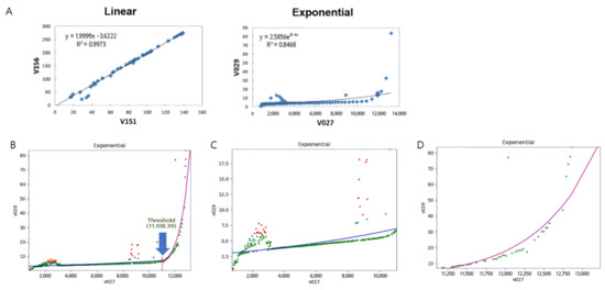 Regression analysis to show the correlation between two sensors. (A) Grouping two sensors to observe whether they were correlated or not. Meaningful relationships in the semiconductor manufacturing process were linear and exponential. (B) Support vector regression method for the fault detection in the exponential relationship. This relationship could be divided into two sectors based on its threshold. The regression analysis was applied to the respective sector, (C) before and (D) after the threshold value.
