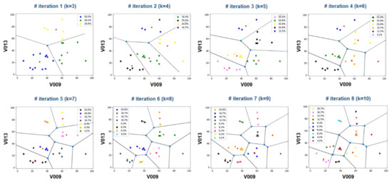 For the non-correlated sensor pair, we applied a k-means clustering method with a Voronoi diagram. Actually, the choice of the similarity measures can highly affect the results of clustering. One might look at the sensor data in terms of the time-series data [36]. However, the time-series analysis is related to high-dimensional data, which involves some challenges: (i) the curse of dimensionality and (ii) difficulty in the graphical representation. A significant task to enhance the performances of the time-series is to reduce their dimensionality while preserving the main characteristics and reflect the original similarity of such data. When treating the time-series, the similarity between two sequences of the same length can be calculated by combining the ordered point-to-point distance between them. The most used distance function is the Euclidean distance, corresponding to other distance measuring methods. Thus, in our study, we chose the lower dimension data with the Euclidean point-to-point distance, while the higher dimensions allowed many-to-one point comparisons. In general, the fault detection using an algorithm suffered from the data imbalance problem, since most data should be defect-free in the process, as previously described [37]. Such an imbalance impacted the accuracy in that the algorithm could declare the defect-free to the defective data. To overcome this problem, the data processing techniques named over-sampling and under-sampling were introduced [38]. The over-sampling method could generate the artificial defect data along the line segment between other defective data. In contrast, the under-sampling method removes some defect-free data to match the numbers between the defective and defect-free data. First, we applied the k-means clustering to the data plane with the different k values (Figure 5). Then, we normalized the sensor data to convert the minimum and maximum value of each sensor into 0 to 100. This procedure prevents the misinterpretation caused due to a geometric distortion in the clustering map.