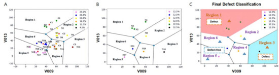 According to its definition, we could use the Voronoi diagram to investigate the relevance to the standard data points and observe the faults afterward when new data came in (Figure 6C). If the newly generated data are located in the defective region, they can be classified as a defect. When the data generated in the defect-free region, it can be classified as defect-free. We employed a binary classification, consisting of ‘positive’ denoting the defect and ‘negative’ denoting the defect-free.