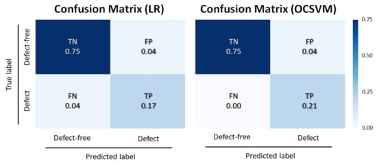 To evaluate the efficacy of our algorithm, we applied two general and intuitive methods; logistic regression (LR) [40] and one-class support vector machine (OCSVM) [41]. Using these two methods, we made the confusion matrixes (Figure 7) and calculated the evaluation metrics (Table 1). The evaluation metrics we used were accuracy, sensitivity, precision, and F1-score. Accuracy is the ratio of the data classified correctly over the whole data. Sensitivity is the ratio of the defect data classified correctly over whole actual defect data. Precision is the ratio of the defect data classified correctly over the whole data classified as the defect. F1-score is the harmonic mean of the sensitivity and precision. These metrics can be expressed as shown below: