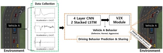 We aim to improve traffic safety by predicting aggressive driving behavior using only low-cost sensor data and sharing it with the surrounding vehicles to reduce the cycle of adverse impacts. Therefore, we propose a 4-layer CNN-2 stacked LSTM-based approach for aggressive behavior classification and a V2X-based driving behavior sharing system. The proposed system reduces cost by using time series data of only 3-axis accelerations to classify aggressive behavior. In addition, we use the traffic simulator IPG CarMaker [21] to build a road that mimics the real-world environments, and generate a training dataset by repeatedly human driving vehicles with various driving behaviors. The training dataset is supplemented by adding real road driving data as well as simulators. The vehicle’s driving behavior is shared with nearby vehicles [22], pedestrians or traffic light systems through V2X communication. We built a prototype module including an NVIDIA Jetson TX2 board and a V2X device. Vehicles equipped with the prototype module transmit driving behavior in real time to the surrounding vehicles via V2X communication. The proposed system has been verified in the simulation and a real vehicle, and can be configured at low cost with only an IMU, V2X device, and a mini PC. In addition, traffic safety can be improved by notifying the surrounding vehicles of aggressive driving behavior, and there is a possibility of applying various applications through V2X communication.