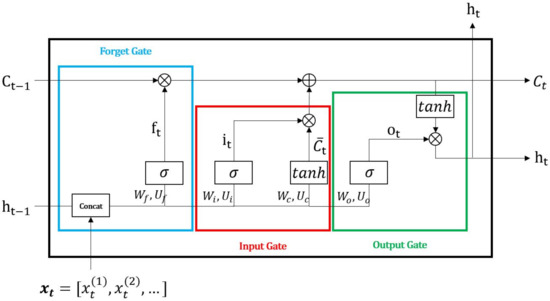 LSTM is composed of an input gate, an output gate, and a forget gate that combines short-term memory and long-term memory, solving the vanishing gradient problem of general RNNs [38]. Figure 2 shows the general structure of LSTM. LSTM has four interactive modules, and learning is performed through the following equations: