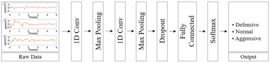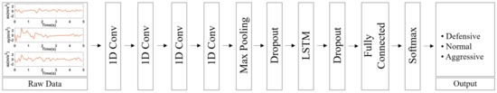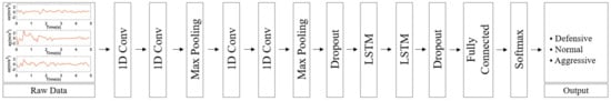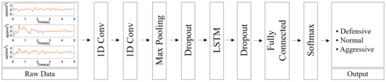 Figure 1 shows the structural diagram of the proposed system. The proposed system can measure the 3-axis acceleration of each vehicle in 10 ms cycle through IMU. Four-layer CNN-2 stacked LSTM is performed to predict the behavior of the vehicle using measured information from time series data as input. The vehicle’s behavior is predicted to be defensive, normal or aggressive behavior. After that, the predicted behavior of the driving vehicle is inserted into the BSM. The BSM containing the driving vehicle’s behavior information is transmitted to nearby vehicles through the V2X module. Nearby vehicles can drive more safely by sharing the driving behavior of other vehicles.