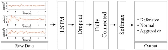 The configuration of the LSTM network is as shown in Figure 5. The LSTM network consists of one LSTM layer and one fully connected layer. Overfitting is prevented through a dropout layer, and driving behavior is finally classified through a softmax.