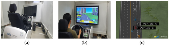 To collect the driving behavior dataset through simulation, we built a simulation driving environment as shown in Figure 10a. To mimic the real driving environment, we utilized a driving simulator. The compact driving simulator is composed of real vehicle parts, and the steering reaction force that feels the same as the real one is reproduced. We connected the driving simulator and CarMaker to perform simulation driving as shown in the Figure 10b. Each simulated road environment has one driver-driven vehicle and more than 200 traffic vehicles that mimic real drivers. In this environment, the simulated driving was repeated 3 times for a total of 3 driving behaviors by 3 drivers along each road environment to generate 27 driving profiles, which were used as datasets. At each iteration, the location of the lane change event of all traffic vehicles except the control vehicle, the number of lane changes, and the initial target speed is randomly reassigned. Each traffic vehicle uses Adaptive Cruise Control (ACC) to avoid collisions with other vehicles. Thus, interaction with surrounding vehicles occurs. For example, in Figure 10c, decelerates rapidly under the influence of making a lane change. The target speed of the traffic vehicle changes to a random value in the range of 10% of the speed limit every 1.5 s. In addition, each driving vehicle performed a lane change event in a random section, creating a complex environment similar to real roads.