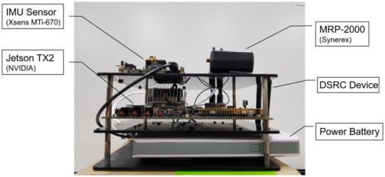 Figure 12 is a prototype of the 4-layer CNN-2 stacked LSTM-V2X system for predicting and sharing driving behavior. NVIDIA Jetson TX2 is used as a small computing board to drive the proposed 4-layer CNN-2 stacked LSTM-V2X system. The V2X device for sending and receiving BSM is Ettifos ETF-DV-02. In addition, the MTi-670 is mounted as an IMU for measurement of longitudinal and lateral acceleration. The prototype was equipped with an MRP-2000 GPS to collect the vehicle’s driving trajectory and a battery to power each device. Jetson TX2 was selected because of its 4-layer CNN-2 stacked LSTM network operation and compatibility with the used V2X device. The total size of the prototype is 180 × 180 × 95mm, and consists of three layers. The first layer is the battery and V2X device, the second layer is the computing board, and the third layer is the IMU and GPS.