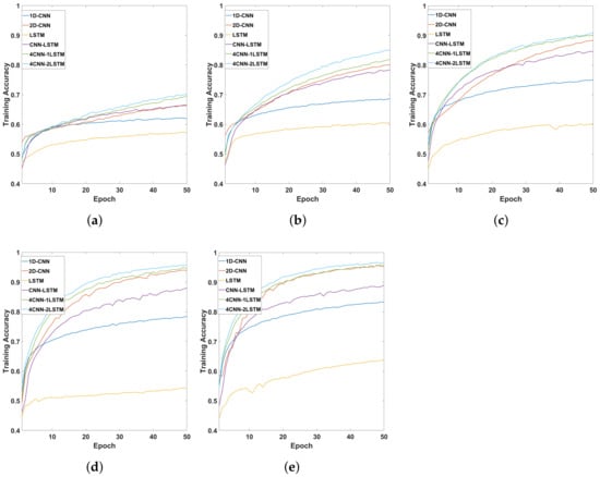 Training accuracy input length: (a) Timeseries 1 s. (b) Timeseries 2 s. (c) Timeseries 3 s. (d) Timeseries 4 s. (e) Timeseries 5 s.