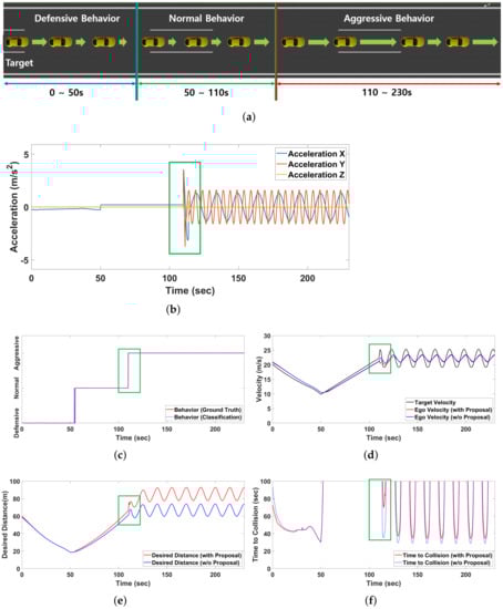 In the simulation, the target vehicle performs 50 s of defensive behavior, 60 s of normal behavior, and 120 s of aggressive behavior. To clearly show the effect of the target vehicle’s aggressive behavior to the ego vehicle, the target vehicle was set to perform periodic acceleration and deceleration. Figure 14a represents the movement of the target vehicle in the simulation. The target vehicle decelerates at a maximum of 0.2658 m/s from 0 to 50 s in defensive behavior, and accelerates at a constant rate of 0.2 m/s in normal behavior from 50 to 110 s as shown in Figure 14b. Aggressive behavior is expressed an acceleration of 1.3 m/s to −1.3 m/s through a function at a 15-second cycle from 110 to 230 s. As shown in Figure 14c, the driving behavior of the target vehicle through the 4 layer CNN-2 stacked LSTM showed high-accuracy classification results.