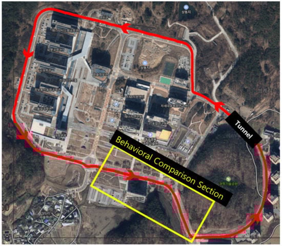 The 4-layer CNN-2 stacked LSTM-V2X system was installed in two vehicles and verified in a real road environment. In a real-world test, human drivers select a label for their driving behavior as one of defensive, normal, and aggressive. Driving behavior is self-defined, and the guidelines of the AAA Foundation and DMV were followed in the same way as the dataset generation. The behavior classification accuracy was measured by comparing the driving behavior received through V2X with the driving behavior labeled by the driver. Figure 15 shows the path of the vehicle driven for real world test. The red line indicates the driving path of the vehicle and the arrow indicates the driving direction. As GPS information is not received in the tunnel section, it is not displayed on the path. Figure 16a–c shows the 3-axis acceleration information about driving behaviors labeled by the driver in the behavioral comparison section marked in yellow in Figure 15. The more aggressive the driver’s driving behavior, the greater the change in 3-axis acceleration. In addition, the amount of change in the z-axis is large because the aggressive driving behavior does not reduce the speed sufficiently on the speed bump.