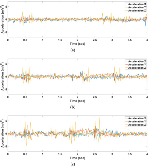Comparison of 3-axis accelerations according to driving behavior: (a) Defensive driving. (b) Normal driving. (c) Aggressive driving.
