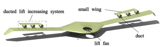 Conceptual graphs of vertical take-off and landing fixed-wing UAV, which includes a lift fan and ducted lift-increasing system.