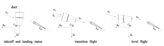 The process of UAV take-off and transition to level flight is shown in Figure 3. During vertical take-off and landing, the duct deflects to provide upward thrust, and the lift fan in front also generates upward thrust. In the transition process, the forward-flying thrust is obtained by deflecting the duct inclination, and the transition from vertical take-off to horizontal flight is completed under certain control strategies. In level flight, the duct is deflected to the horizontal position, and the flight is controlled by the deflection of the control surface.