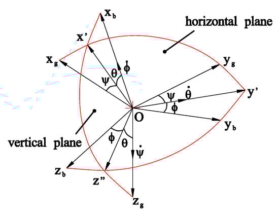 It can be seen in the body axis formation process that is formed by the angular velocity along the axis; is formed by the angular velocity along the axis, which is projected along the body axis as ; is formed by the angular velocity along the axis. It can be concluded that the projection of the rotational angular velocity on the shaft system of the body is