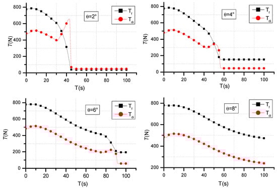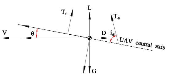 Figure 5 shows the force diagram of the UAV during the transition flight. In this diagram, is the fuselage angle of attack, and L and D are the wing aerodynamic lift and drag respectively, which include the aerodynamic force of the main wing’s free flow and the main wing-induced aerodynamic force. According to the force of the UAV, the balance relationship can be analyzed as follows: