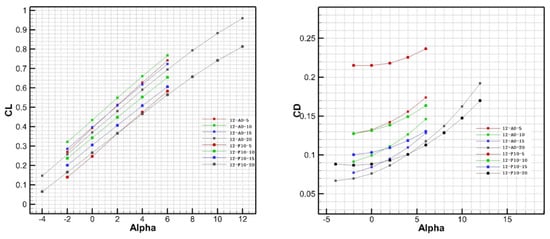 Taking a certain type of vertical take-off and landing fixed-wing UAV as a case prototype, the ducted lift-increasing system’s deflection angle–speed envelope during the transition flight is calculated [20]. Wang C et al. [20] studied the dynamic modeling and transitional flight strategy of this type of aircraft but did not study its transitional flight corridor. The calculation of the transitional flight corridor is studied in detail below. Figure 6 shows the relationship between the lift coefficient and drag coefficient of the prototype during transitional flight with the angle of attack. In the legend, “12-A0-5” means that the ducted lift-increasing system has a single ducted power of 12N, the angle of attack is 0°, and the free flow is 5 m/s. The aerodynamic data at specific state points in the transition process are calculated based on the aerodynamic coefficient curve. The rated power and calculation parameters of the lift fan and ducted lift-increasing system are shown in Table 1.