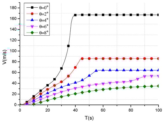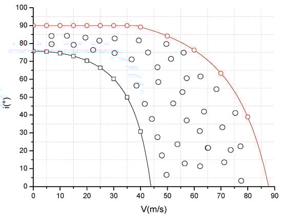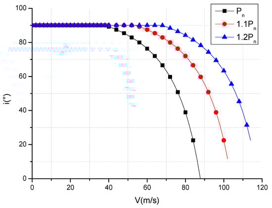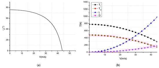Thus, in the case of the power limitation, the VTOL fixed-wing UAV’s angle–speed envelope boundary must satisfy the force balance, and, at the same time, the total power of the lift fan and duct must be less than the available power of the system , i.e., .