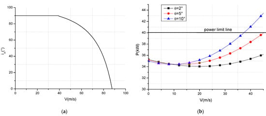 Results of the calculation of the transition corridor calculation based on power limitation. (a) Deflection angle of ducted lift-increasing system’s force. (b) Power curves of different attitude angle.