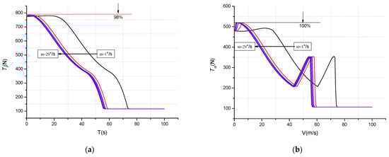 The influence of different deflection speeds on power. (a) Pull-force change curve of lift fan; (b) pull-force change curve of ducted lift-increasing system.