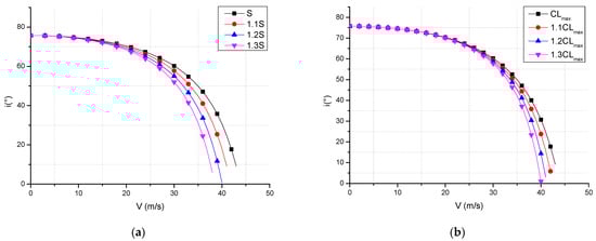 The influence of aerodynamic parameters on the flight corridor. (a) Influence curve of wing area; (b) influence curve of maximum lift coefficient.